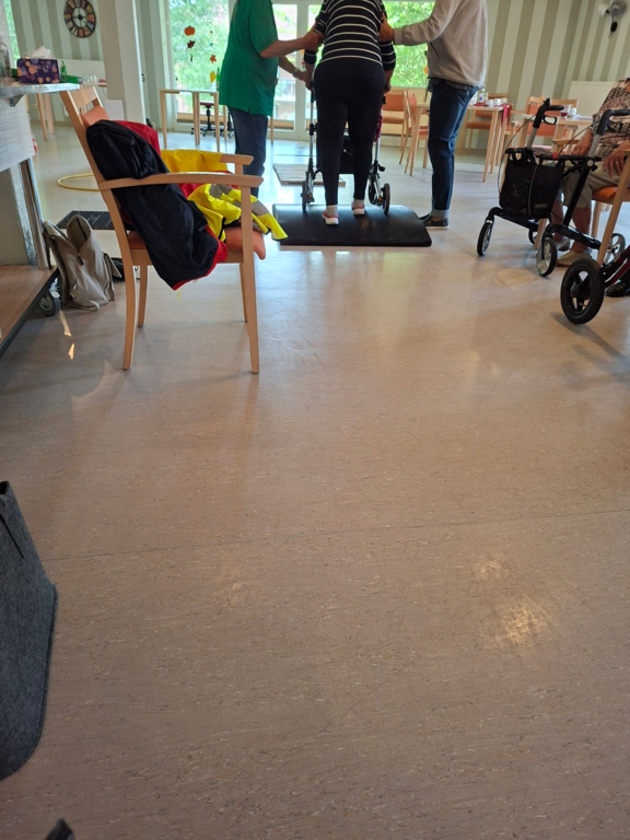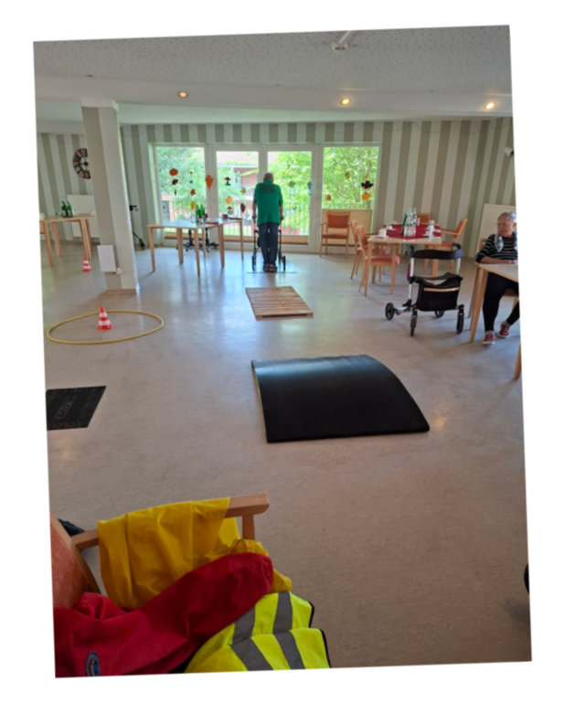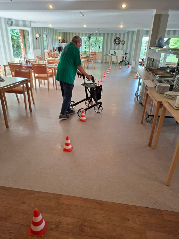 Im Speisesaal der Einrichtung wurde unser Rollatorparcour mit einigen kleinen Hindernissen sowie einem kleinen Slalomparcour aufgebaut.