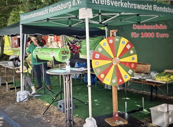 Darüber hinaus kam unser Glücksrad wieder zum Einsatz. Die Gewinne waren u. a. Warnwesten, Klackbänder, unsere beliebten Leuchtsmileys, Malbücher etc. - Verkehrssicherheit spielerisch erlernt!